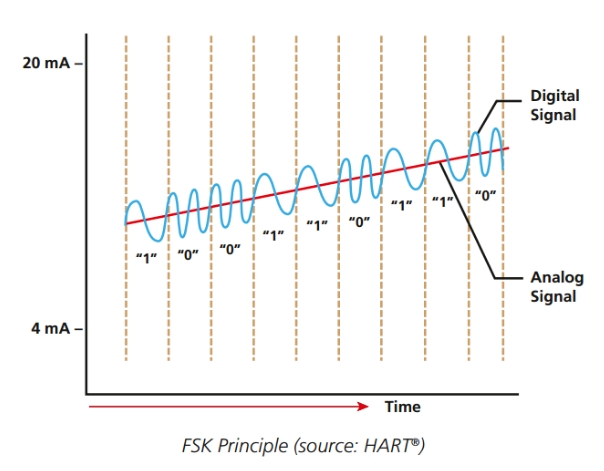 HART®(Highway Addressable Remote Transducer) (高速可寻址远程转换器)是一种基于Bell 202电话通信标准的通信协议,使用FSK(频移键控)原理。该信号由两部分组成,模拟4-20 mA电流回路和叠加数字变频信号。
