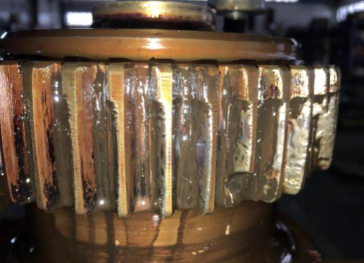 推断这台减速机应该在初期产生问题时,客户没有及时停机检修,又坚持使用了一段时间,不得已才停的机,按照铁粉量的产出,客户的稀油站滤芯应该早已失效,或者直接拔出未装。不然,油站都无法正常使用。