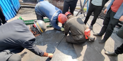 现场实操由皮带队赵胜利、杨文生两位队长现场实操讲解。通过皮带订扣这一项目规范检修工订扣时的标准操作。首先由赵队长详细介绍皮带的宽度,订扣所需的工器具,钉扣机的使用方法,订扣标准和操作规程。其次,由杨队长测量尺寸,定点画线,切割皮带并订扣。期间,检修工每操作一步,两位队长都会细说要点及注意事项。