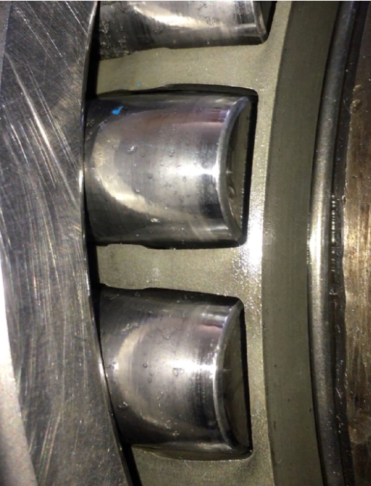 滚动体表面布满凹坑,越靠近轴承中间部位,凹坑越密集。两排滚珠都是越靠里面的位置凹坑损伤越严重,该轴承的安装位置在输入轴联轴器端,另一端的轴承损伤程度相比这边要好很多,不是很严重,看起来是有一些磨损与擦伤,减速机的其他位置的轴承损伤程度相比较也没有这个严重。那这个故障是怎么形成的,是什么原因促使它在短期内发生剥落,需要我们逐步分析一下。