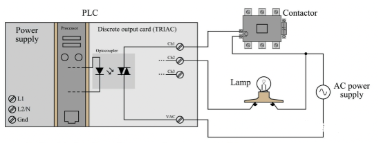 指示灯、电磁阀和电机启动器(由接触器和过载保护装置组成的组件)都是离散控制装置的例子。以类似于离散输入的方式,PLC 通过离散输出通道连接到任意数量的不同离散最终控制设备。离散输出模块通常使用相同形式的光隔离,以允许 PLC 的计算机电路向负载发送电力:内部 PLC 电路驱动 LED,然后激活某种形式的光敏开关设备。或者,可以使用小型机电继电器来代替光隔离半导体开关元件,例如晶体管 (DC) 或 TRIAC (AC):