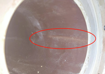 检查避雷器下部绝缘筒,发现最底层破损电阻片对应位置内筒壁上有电阻片迸出痕迹,并有大量绿色粉末附着;内部发现一颗小螺丝,螺丝外观整洁无装配痕迹,避雷器器身也没有该型号螺丝,如图6所示。检查避雷器上部绝缘筒,发现顶部内壁上有发热痕迹,且表面有明显粉状物附着,如图7所示。