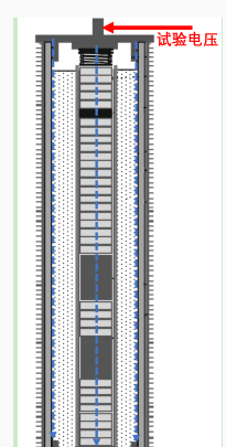 避雷器下部电阻片向外崩裂后碰撞内筒壁并形成大量绿色粉末,由于筒壁内为密封结构,在高电压下大量粉末附着在内侧筒壁,顶部看也能明显看到内壁附着物。内壁的附着物导致绝缘电阻试验时泄漏电流的旁路分流,导致泄漏电流增大,绝缘电阻降低,如图8所示。